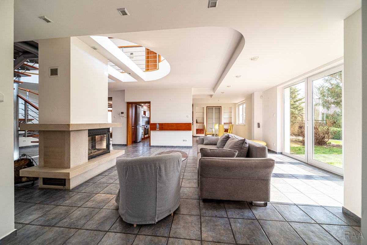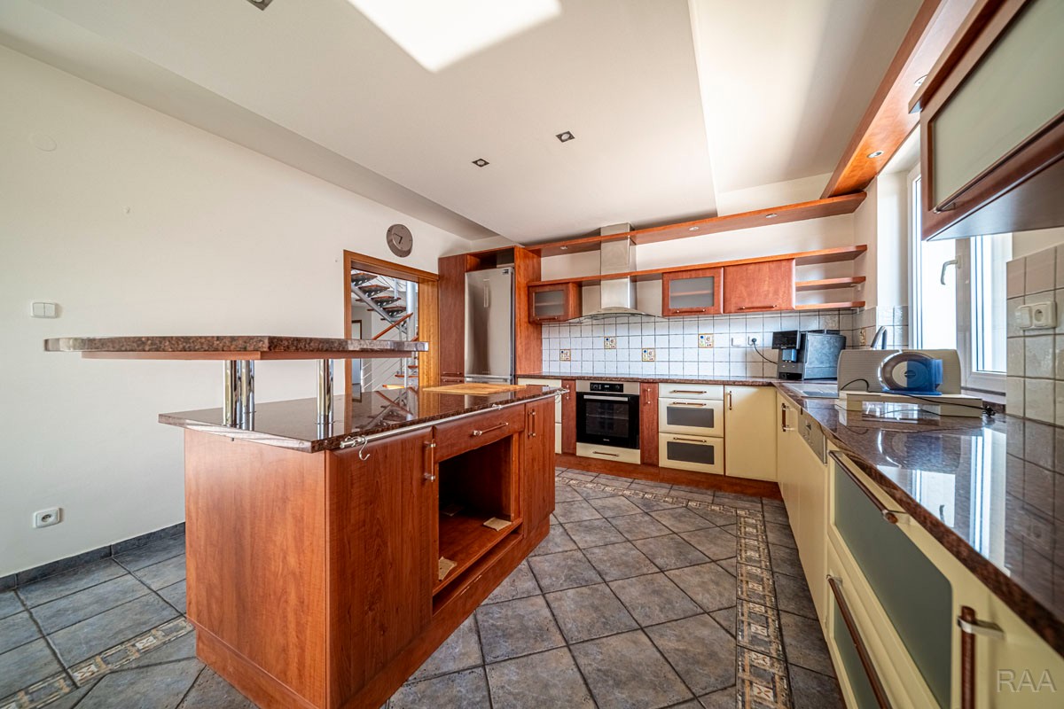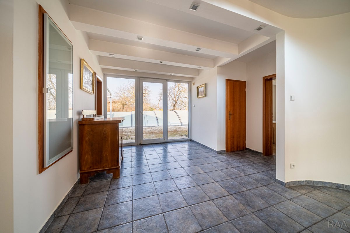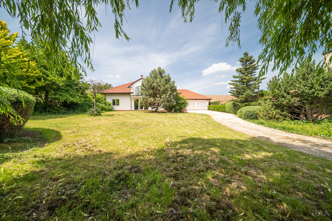 Prodej nadstandardního rodinného domu v obci Kudlovice (cca 9km vzdáleno od Uherského Hradiště, cca 11 minut po dálnici D55). Pozemek celkem 2545m². Užitná plocha domu 250m². Venkovní zastřešený bazén s filtrací má rozměry šířka 5m x délka 10m x hloubka 1,6m, zastřešení je zasouvatelné. Dům je ideálním útočištěm pro ty, kdo hledají klid a bezpečí - od ulice jej chrání masivní zídka, která zajišťuje naprosté soukromí a chrání pozemek před pohledy zvenčí. Příjezd k domu po obecní asfaltové silnici. Napojeno na všechny inženýrské sítě: elektřina, vodovod, kanalizace, plyn. Vytápění plynovým kotlem se zásobníkovým ohřívačem teplé vody. Dům je jednopodlažní, nepodsklepený s obytným podkrovím. Základy železobetonové pasy, svislé nosné a obvodové stěny betonové systému ztraceného bednění VELOX, z exteriéru opatřeno kontaktním zateplovacím systémem, vnitřní příčky z plynosilikátu YTONG, zastřešení glazovanými keramickými taškami, klempířské prvky z mědi, na střeše osazen bleskosvod. Podlahy keramické dlažby, v 2. NP (podkroví) plovoucí podlahy. Venkovní okna a dveře plastová s termoizolačním dvojsklem. Vnitřní dispozice: 1.NP (přízemí): garáž pro 2 os. automobily, technická místnost, vstup do domu, obytný prostor s krbem a centrálním schodištěm do patra, kuchyně s jídelním koutem, pracovna, pokoj, koupelna s rohovou vanou a sprchovým koutem, samostatné WC; 2.NP (podkroví): schodišťový prostor, 3x pokoj, koupelna, 2x terasa, 2x šatna, půdní prostory. Kolem domu je okrasná udržovaná zahrada se vzrostlými stromy. Vstup na pozemek z ulice přes portál s brankou a automatickou vjezdovou bránou, přičemž portál je umístěný v zídce o výšce 2,2m, uliční šířka pozemku 23m. Vše funkční a ve výborném stavu, výstavba v r. 2004. Volné ihned.